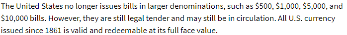 بر اساس متن سایت USA.GOV، اگرچه اسکناس هاس 500 دلاری، 1000 دلاری ، 5000 دلاری و 10000 دلاری آمریکا دیگر چاپ نمی شوند ولی دارای ارزشی برابر با رقم مندرج در اسکناس می باشند.